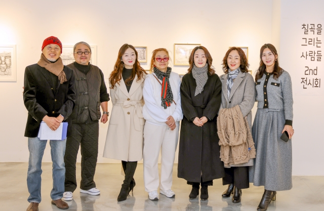 <사진>,‘칠곡을 그리는 사람들전에 참여한 작가들이 전시장인 칠곡군 왜관읍 갤러리 파미에서 기념촬영을 하고 있다. 왼쪽부터 정문현, 김현수, 박창미, 이택경, 박현아, 이정숙, 이윤경 작가.