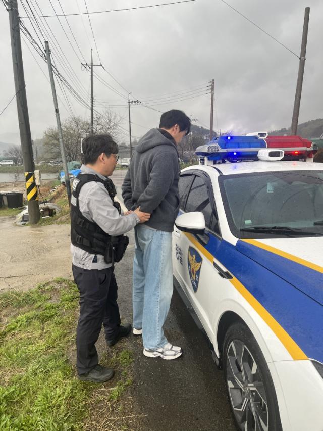 전자발찌를 착용한 헤어진 남자친구가 여자친구를 차량에 태워 도주하고 있는 상황을 설정한 성주경찰서의 범죄 현장 대응능력 강화를 위한 스마트워치를 활용한 실전 훈련상황이었다.