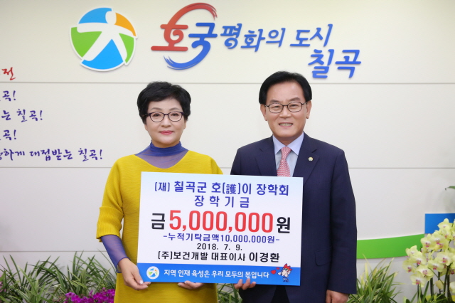 ㈜보건개발 이경환 대표이사는 9일 지역인재육성과 교육발전을 위해 써달라며 (재)칠곡군호이장학회에 호이장학금 500만원을 기탁했다.