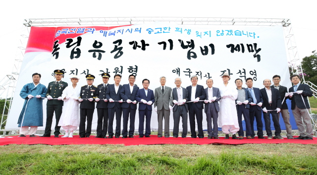 칠곡군, ‘제74회 8·15광복절 기념’ 독립유공자 기념비 이전 제막 및 헌화행사 개최【경상포커스=배성호기자】칠곡군(군수 백선기)은 15일 왜관읍 석전리 애국동산에서 백선기 군수를 비롯해 독립유공자 유족과 기관·사회단체장, 청소년 등 200여 명이 참석한 가운데‘제74주년 8·15광복절’을 맞아‘독립유공자 기념비 이전 제막 및 헌화행사’를 가졌다.
