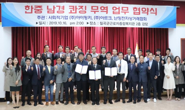【경상포커스=배성호기자】칠곡군 사회적기업 ㈜아이밍키는 16일 칠곡군 근로자종합복지관에서 부산광역시 소재 ㈜아르크(대표 김현태), 중국 난징전자상거래협회 3자가 모여 중국 난징(南京)의 콰징(跨境-중국 직구․역직구 전자상거래) 종합시험구와 제품전시관단지 건설 추진에 있어 ‘한국 상품의 유치와 개발에 관한 업무 공동 추진 협약식’을 체결했다.