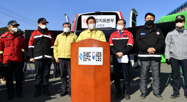 이에 도내 시군에 총동원령을 내려 17일 일출과 동시에 공중과 지상에서 산불진화헬기 40, 진화차 54, 소방차 126대 등의 장비와 진화대 500(전문 388, 특수 73, 공중 39), 공무원 1202, 소방 645, 군인 300명 등 총2700여명을 집중 투입해 진화를 완료했다.