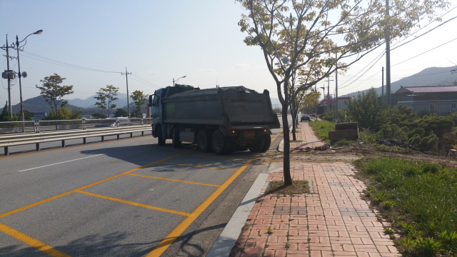 【경상포커스=김경희 기자】칠곡군 북삼읍 S아파트 신축 공사 현장에서 뻘과 흙을 관내 농지에 성토용으로 운반하는 25t 덤프트럭이 김천에서 왜관방향으로 운행하다 후진으로 성토현장 농지에 진입 하면서 인도를 파손 하는 등 길은 엉망이 되는데도 단속이 제대로 이뤄지지 않고 있어 관계당국의 대책이 시급한 실정이다.